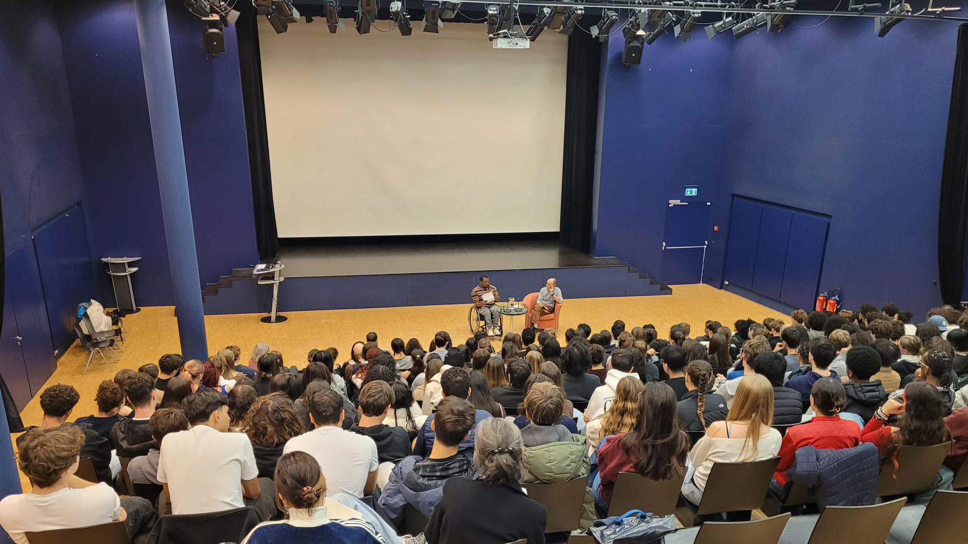 Novembre 2025. Mamadou Sow, auteur de La route à bout de bras, ovationné par les 220 élèves de 3è du Collège Sismondi à Genève après une heure et demie d’échanges passionnants au sujet du handicap et de la migration. Ils avaient auparavant lu et étudié son livre dans le cadre des cours de géographie consacrés aux migrations.