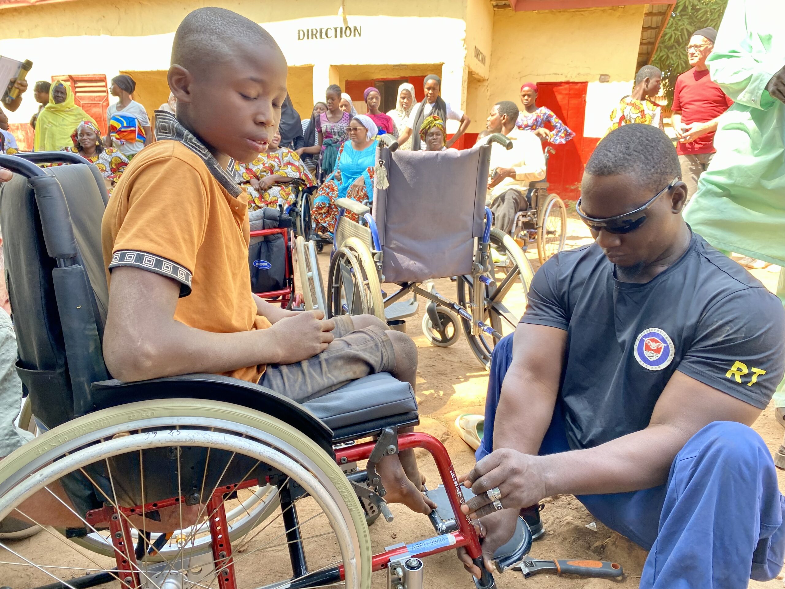 1er juin 2025. Nos partenaires d’ASPH ont organisé le 1er juin 2025 dans le quartier de Kaloum la première sortie du programme d’atelier mobile. Sept personnes ont pu bénéficier d’une réparation de leur fauteuil effectuée dans la rue. Une autre a reçu un fauteuil et beaucoup d’autres attendent leur tour. Ce système a pour but d’éviter le déplacement jusqu’à l’atelier central. Le trajet en taxi ou moto-taxi est cher et souvent les chauffeurs refusent de prendre des personnes se déplaçant avec leur fauteuil, même s’il est pliable.